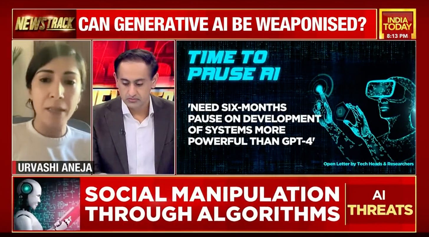 Urvashi was brought on as a guest on India Today's Newstrack segment with Rahul Kanwal, where she spoke about the need for greater transparency around the data being collected and curated to create AI tools and systems.