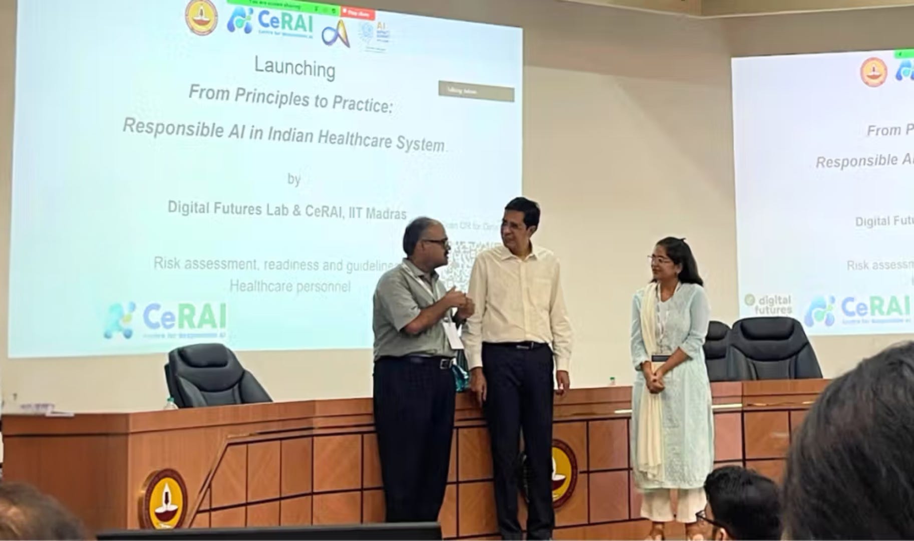 Our project ‘From Principles to Practice: Responsible AI in Indian Healthcare’ was recently launched at the Conclave on AI Governance, organised by WSAI & CeRAI, IIT Madras. Under this initiative, Research Manager Harleen Kaur joins Dr. Geetha Raju, Senior Policy Analyst, CeRAI, and Dr. Gokul S Krishnan, Senior Research Scientist, CeRAI, to identify the challenges of AI in the Indian Healthcare System and limitations of the existing framework. Together, they aim to provide guidance on risk mitigation strategies by evaluating data quality, model robustness, and adoption readiness. Learn more about it here.
